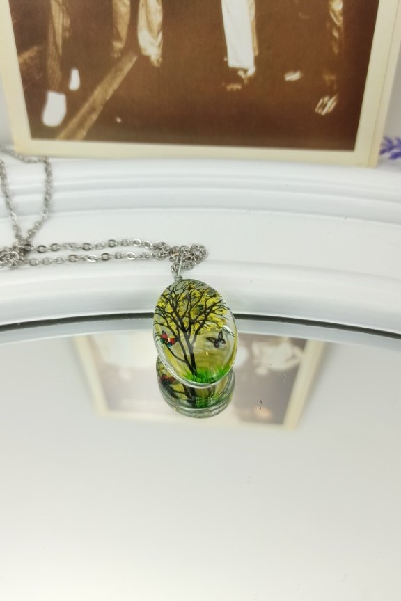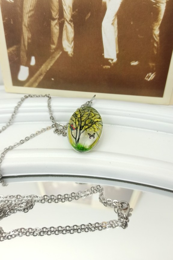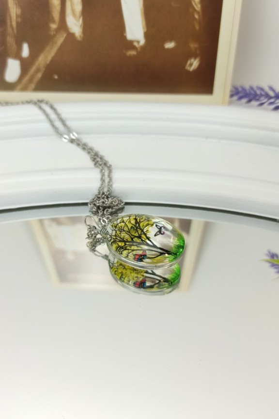 • Ατσάλινο χειροποίητο κολιέ με δεντράκι μέσα σε υγρό γυαλί σε κίτρινο χρώμα.