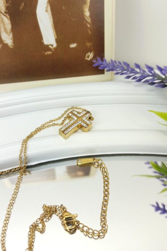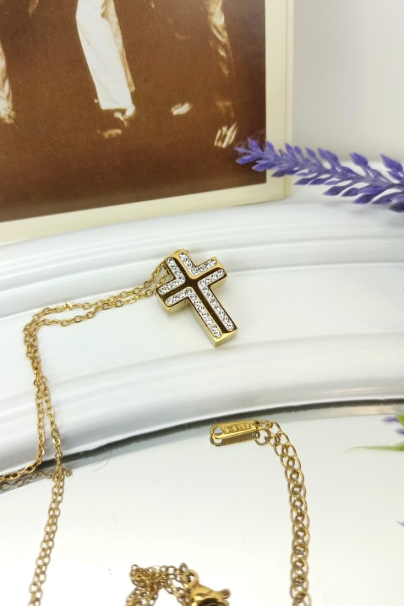 • Ατσάλινο κολιέ σταυρός με διάφανα ζιρκόν σε χρυσό χρώμα.