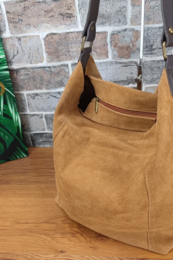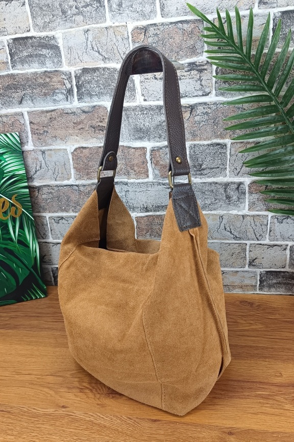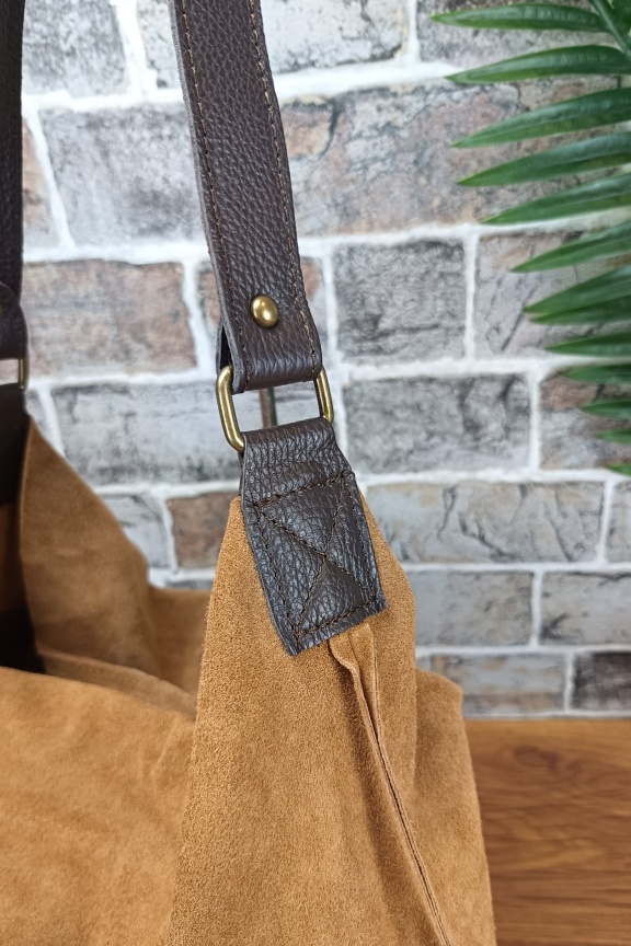 • Χειροποίητη δερμάτινη ορθογώνια τσάντα hobo με δερμάτινη λαβή σε χρώμα κάμελ.
