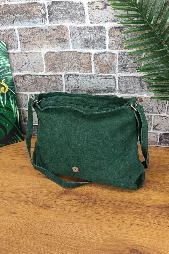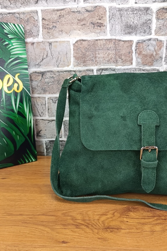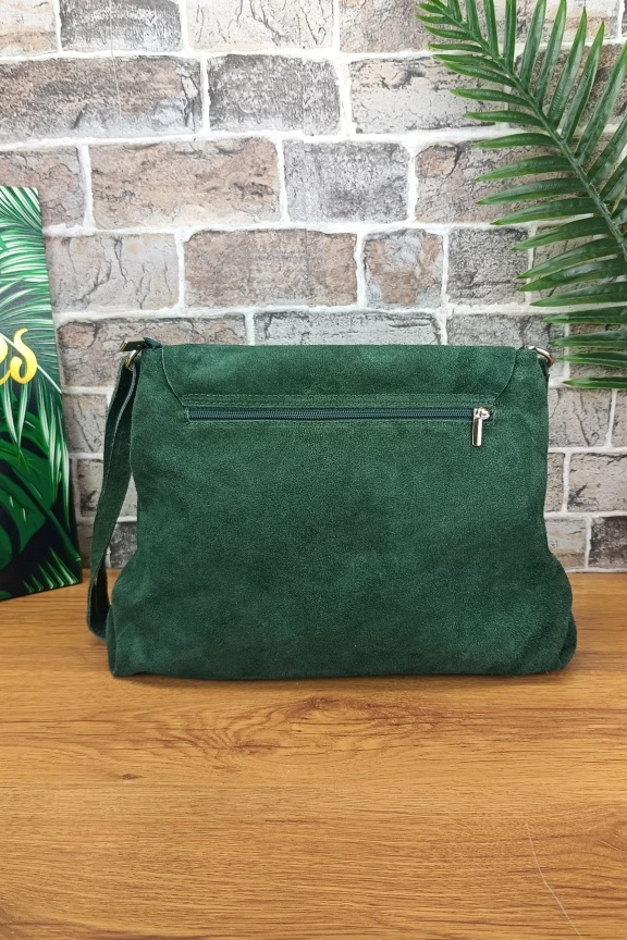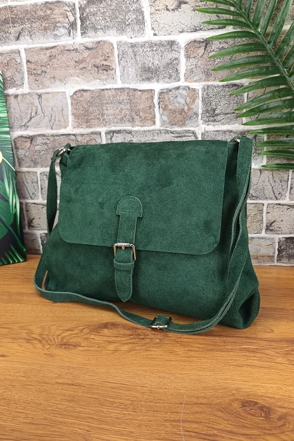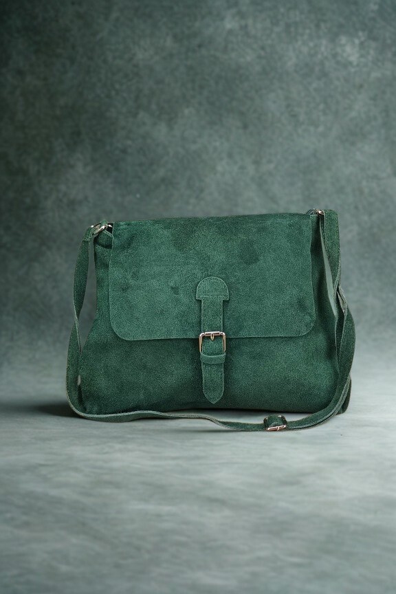 • Χειροποίητη δερμάτινη τσάντα suede σε χακί χρώμα με αγκράφα μπροστά.