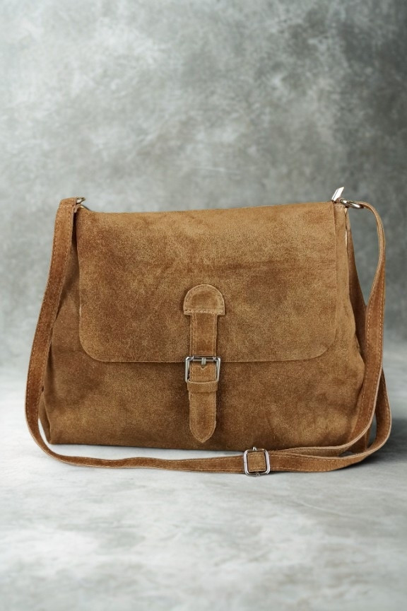 • Χειροποίητη δερμάτινη τσάντα suede σε ταμπά χρώμα με αγκράφα μπροστά.