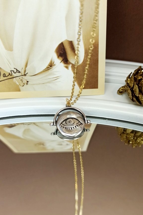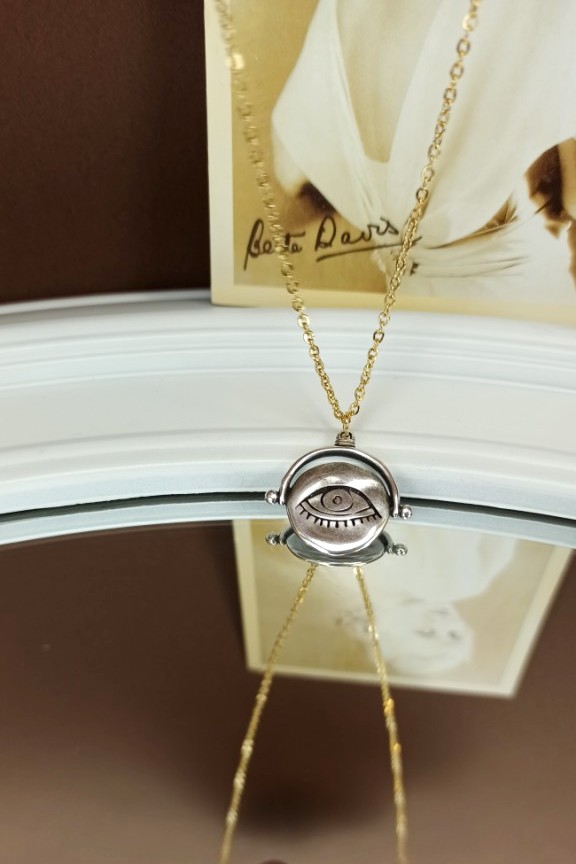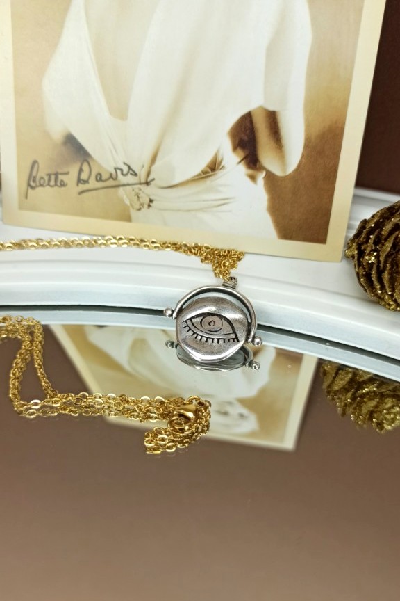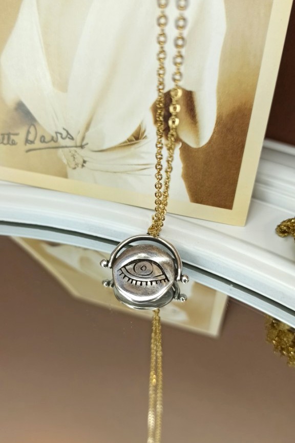 • Ατσάλινο χειροποίητο κολιέ με ανάγλυφο κυκλικό στοιχείο με χαραγμένο στοιχείο ‘μάτι’ σε ασημί χρώμα.