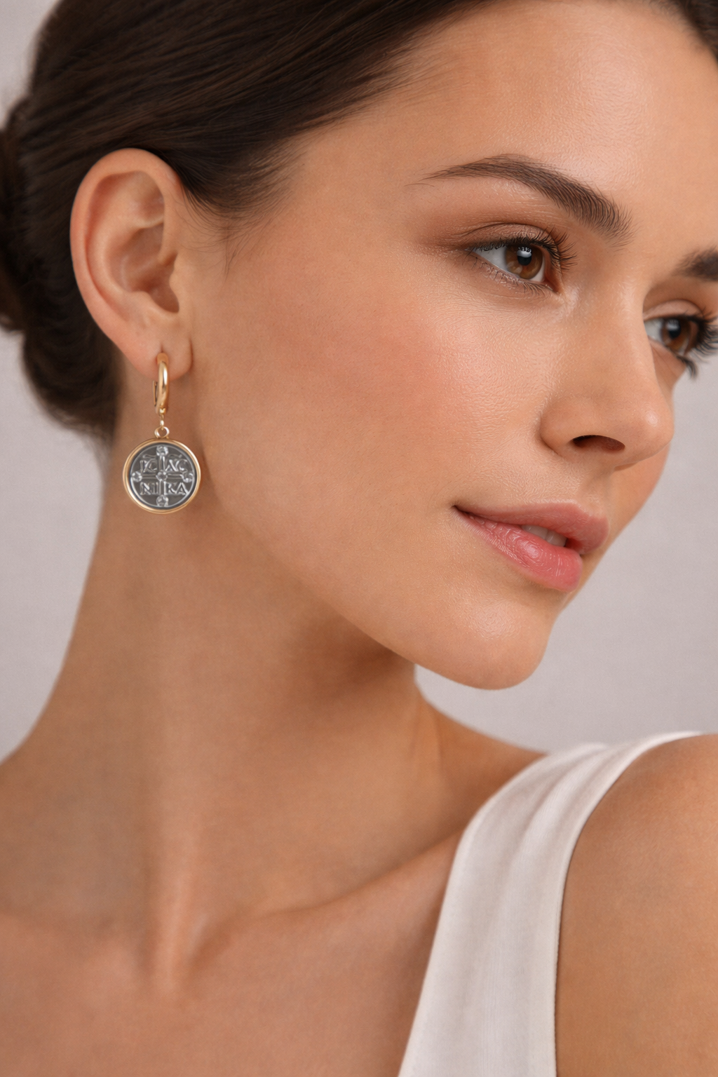 • Χειροποίητα ατσάλινα σκουλαρίκια με κρεμαστό στοιχείο ‘ICXC NIKA’ σε διχρωμία.