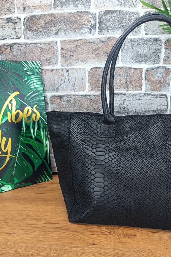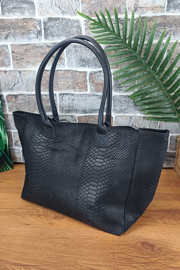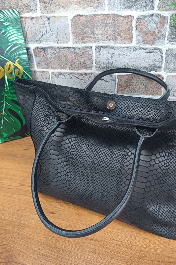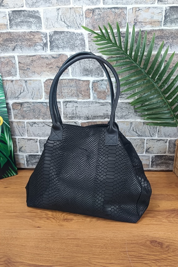 • Χειροποίητη δερμάτινη τσάντα σε μεγάλο μέγεθος με τεχνοτροπία croco σε μαύρο χρώμα.
