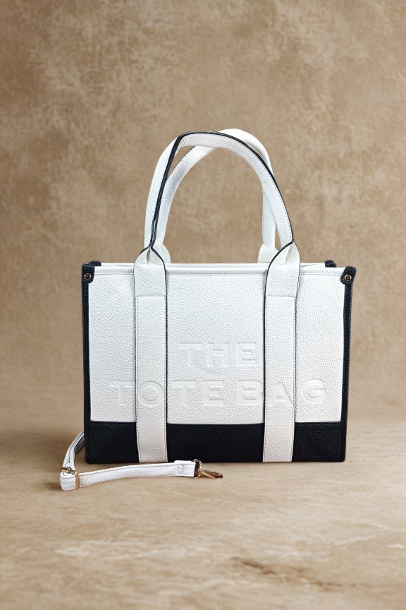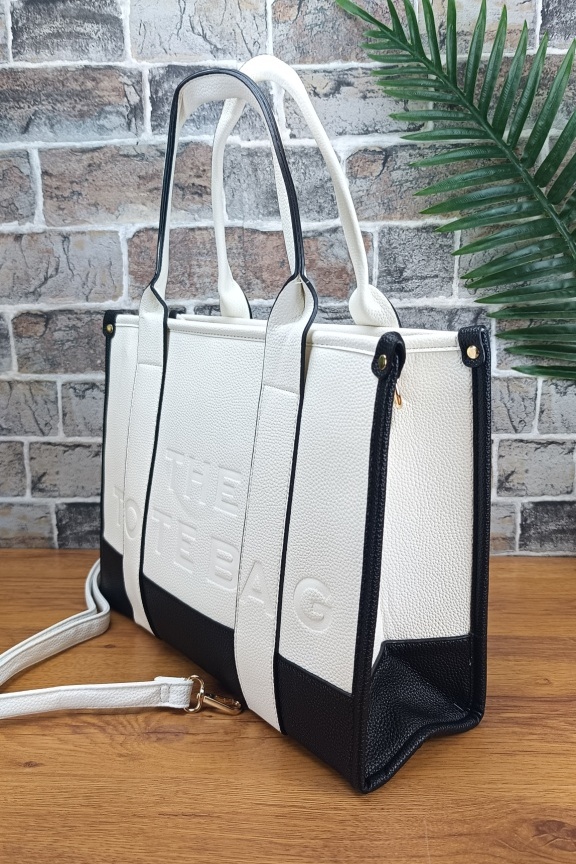 • Τσάντα ώμου tote σταθερής βάσης με ανάγλυφη χάραξη ‘THE TOTE BAG’ σε ασπρόμαυρο χρώμα.