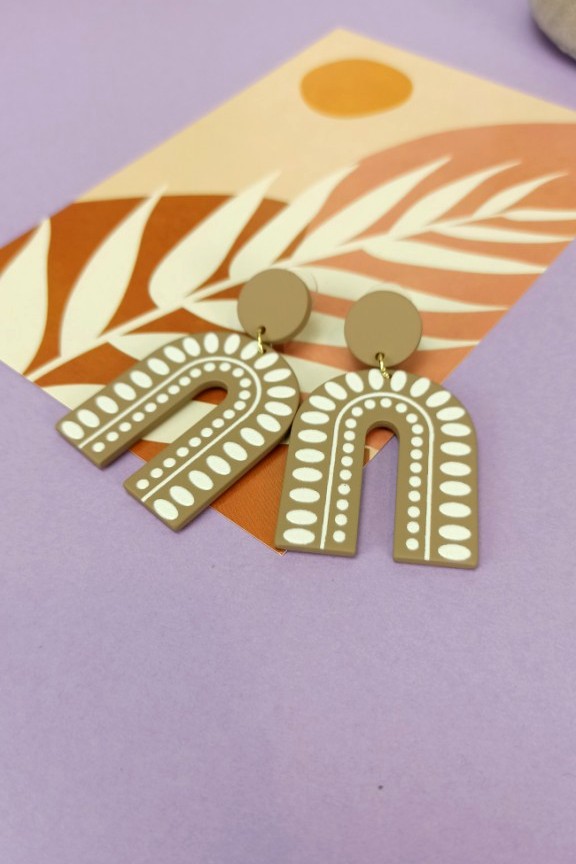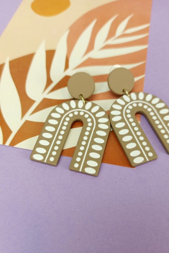 • Σκουλαρίκια ρητίνης γεωμετρικά σε σχήμα U σε μπεζ χρώμα με λευκά tribal στοιχεία.