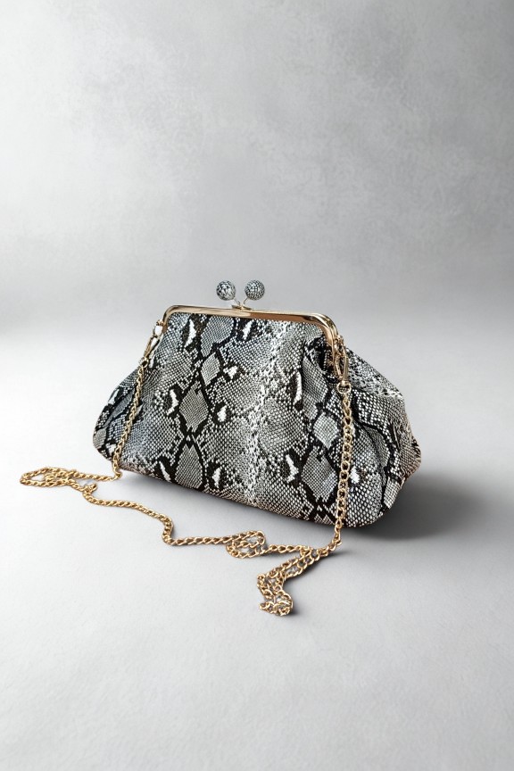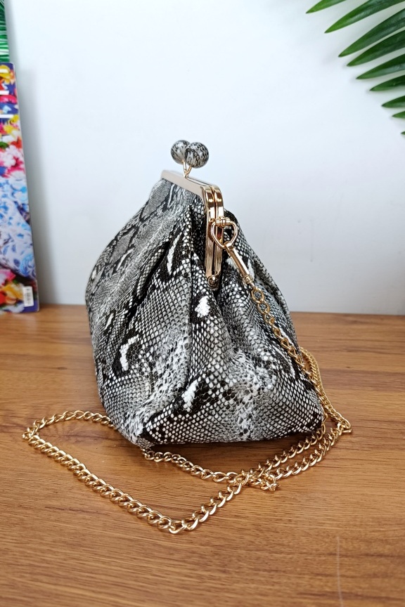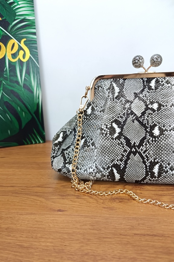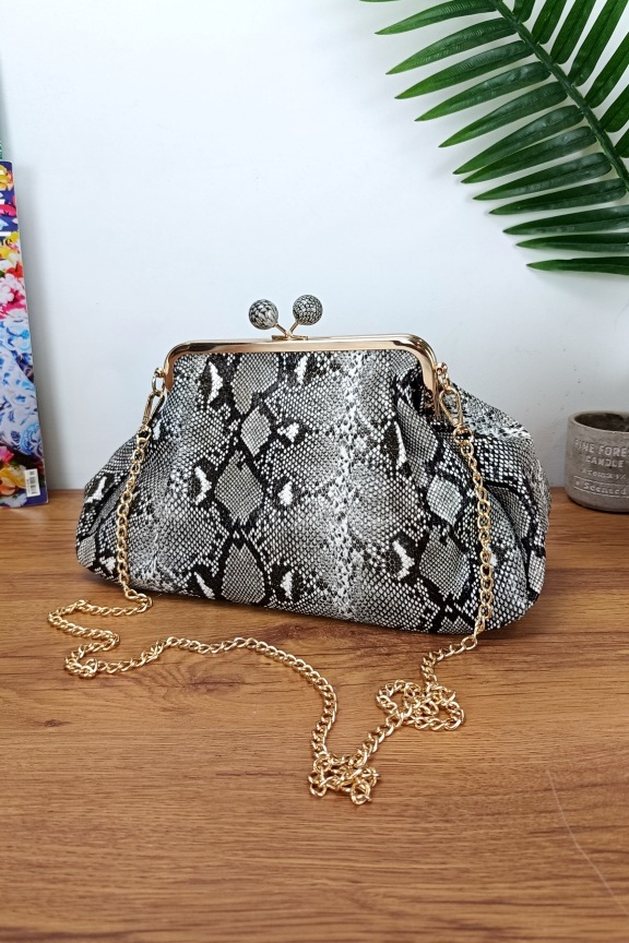 • Τσάντα clutch σε baguette σχέδιο με χρυσή αλυσίδα σε σχέδιο snake print και γκρι χρώμα.