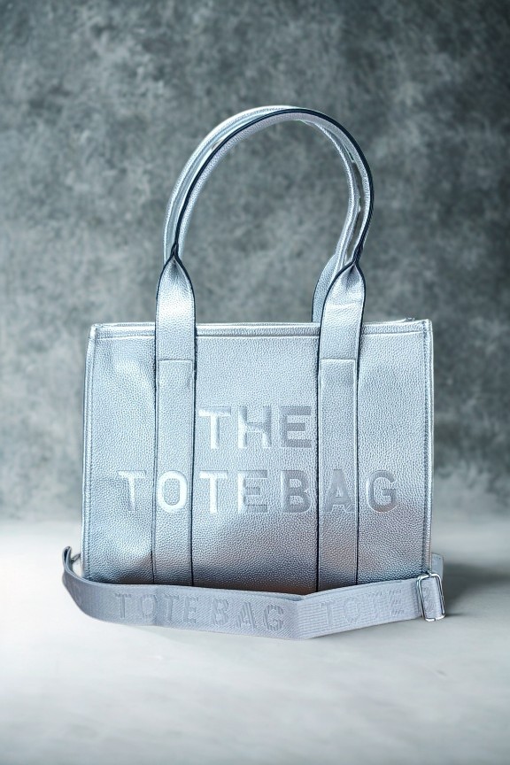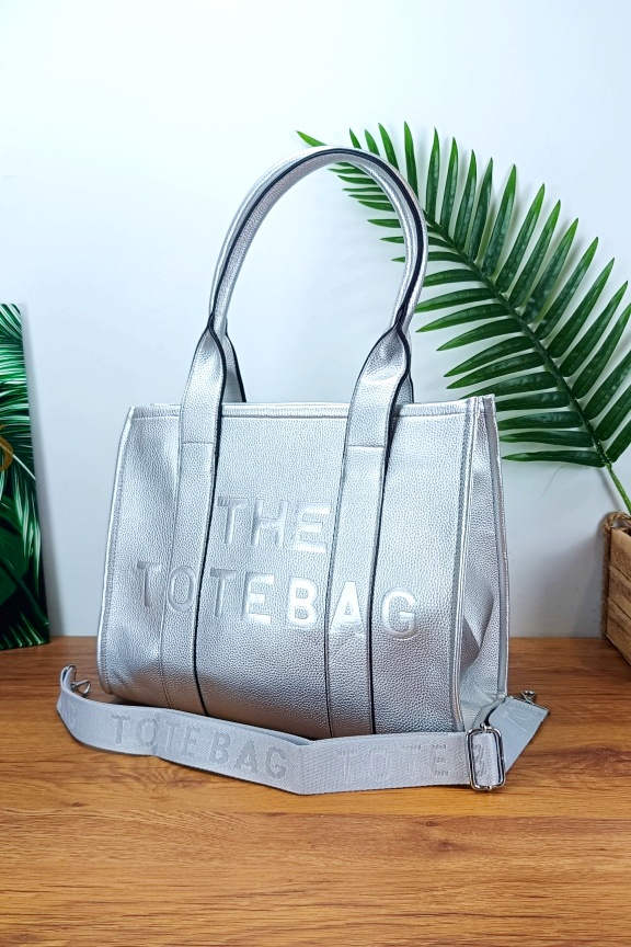 • Τσάντα ώμου tote σταθερής βάσης με ανάγλυφη χάραξη ‘THE TOTE BAG’ σε ασημί χρώμα.