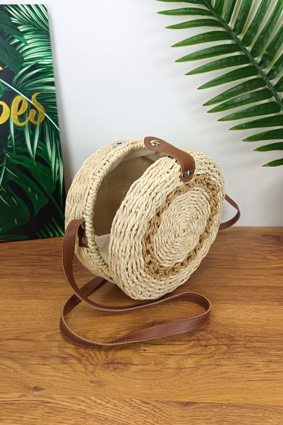 • Χειροποίητη στρογγυλή ψάθινη τσάντα σε εκρού χρώμα με στεφάνι σε μπεζ χρώμα.
