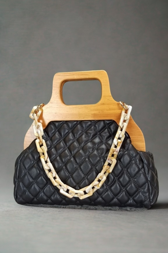 • Μαλακή πολυτελής τσάντα ώμου καπιτονέ με ξύλινη λαβή και κοκάλινη αλυσίδα σε μαύρο χρώμα.
